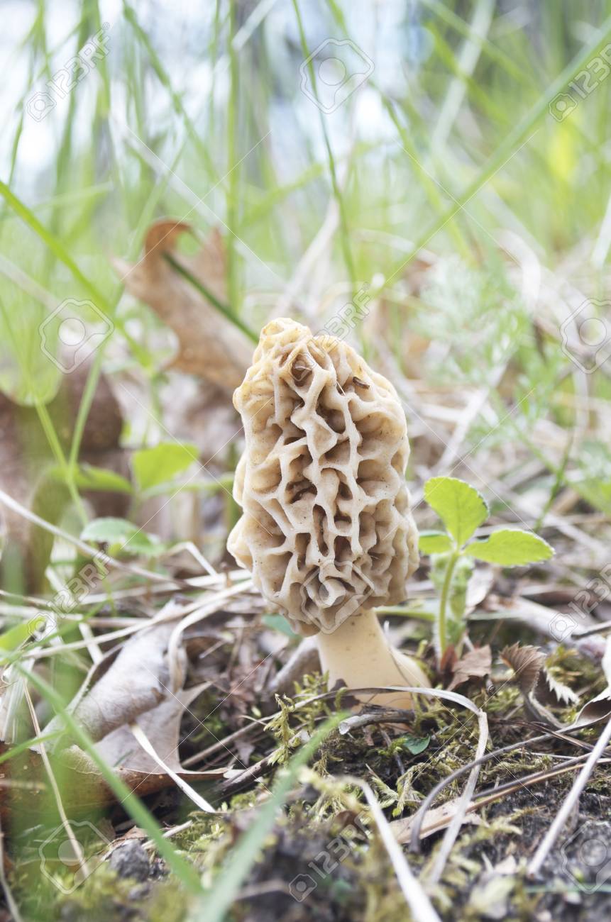 Champignon Morille Blanche Nouvellement Germe Sur Le Sol De La Foret Michigan Banque D Images Et Photos Libres De Droits Image 97539257